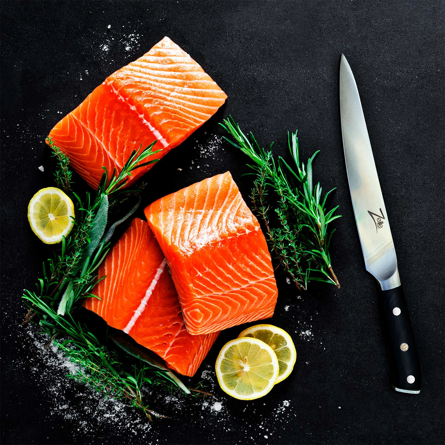 Das 6″ Küchenmesser ist aus deutschem Qualitäts-Edelstahl von Thyssenkrupp und schwarzem Pakkaholz gefertigt. Der ergonomische, dreifach vernietete Griff ist mit einer Mosaikniete versehen und liegt beim Schneiden gut und sicher in der Hand. Das 6″ Allzweckmesser von Zelite Infinity by Klarstein ist ein echter Alleskönner – vom Filetieren von Fleisch und Fisch über Schneiden von Gemüse und Obst bis hin zum Hacken von Kräutern und Nüssen – und damit ein unverzichtbarer Helfer in deiner Küche.