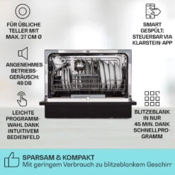 Die Klarstein Amazonia 6 Smart Geschirrspülmaschine ist die neue, clevere Reinigungshilfe in deinem Haushalt! Bis zu 6 Maßgedecke finden in ihrem Inneren Platz. Mit 1380 Watt Leistung und sieben unterschiedlichen Programmen rückt die Amazonia 6 Smart dem verschmutzen Geschirr zu Leibe. Alle Programme lassen sich schnell und einfach über die aufgeräumte Touch-Armatur einstellen oder ganz smart und von überall her mit der App-Steuerung per Smartphone steuern. Die Amazonia 6 Smart ist als Einbaugerät oder Tischgeschirrspüler nutzbar. Ihr edles Design bringt einen Hauch von Luxus in jede Küche und eignet sich auch zur Reinigung von Baby-Flaschen.