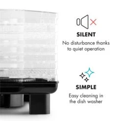 Auf insgesamt 6 Etagen werden Obststücke, Gemüsescheiben, Pilze und Kräuter schonend getrocknet. Selbst große Fische und ganze Fleischscheiben können vom Klarstein Bananarama spielend leicht verarbeitet werden – so lässt sich beispielsweise leckeres Beef Jerky selbst herstellen. Die feinmaschige Zusatzauflage ist besonders praktisch für z.B. kleine Früchte wie Beeren. Die luftdurchlässigen Ablagen ermöglichen in Verbindung mit dem Umluftbetrieb, eine gleichmäßige Hitzeverteilung. Dank variabler Stapelweise lassen sich z.B. auch Fleischstücke ohne vorheriges Zerschneiden verarbeiten. Nach dem Gebrauch und einer kurzen Reinigung werden die einzelnen Ablagen platzsparend ineinander gesteckt, was ein Gesamtmaß von 29,5 x 22,5 x 43,5cm ergibt.