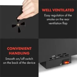 Entdecken Sie die traditionelle Kunst des Räucherns. Mit dem Klarstein Flintstone Räucherofen verleihen Sie verschiedensten Speisen ganz nach eigenen Wünschen den richtigen Geschmack. Und nebenbei erhalten Fleisch, Fisch oder Wurstwaren eine deutlich längere Haltbarkeit! Mit einem 1600 Watt starken, elektrischen Heizelement sowie einem regelbaren Thermostat an der Oberseite des Gerätes bringt der Ofen die Aromaholzschnitzel ordentlich zum Rauchen und gart gleichzeitig die Räucherware ganz langsam zur Perfektion. Drei verchromte Räucherroste mit jeweils 40 x 25 cm Fläche bieten reichlich Platz für Speckseiten, Tofublöcke oder eigene Wurstkreationen, während drei Haken zusätzlichen Platz zum Aufhängen von Würsten oder Schinken bieten. Eine herausnehmbare Tropfschale fängt Kondenswasser und abtropfendes Fett und erleichtert die anschließende Reinigung. Die Dichte des Rauchs wird beim Klarstein Flintstone Räucherofen ganz bequem über eine rückseitige Lüftungsklappe reguliert. Ein in die Tür integriertes Thermometer bis 300 °C macht die Überwachung der Räuchertemperatur ganz einfach. Räucherschnitzel und -aromen werden in der herausnehmbaren Edelstahlschüssel direkt über dem elektrischen Heizelement in leckeren Rauch verwandelt. Dank der Leichtbauweise und einem topseitigen Tragegriff lässt sich der Räucherofen mit wenig Aufwand versetzen.