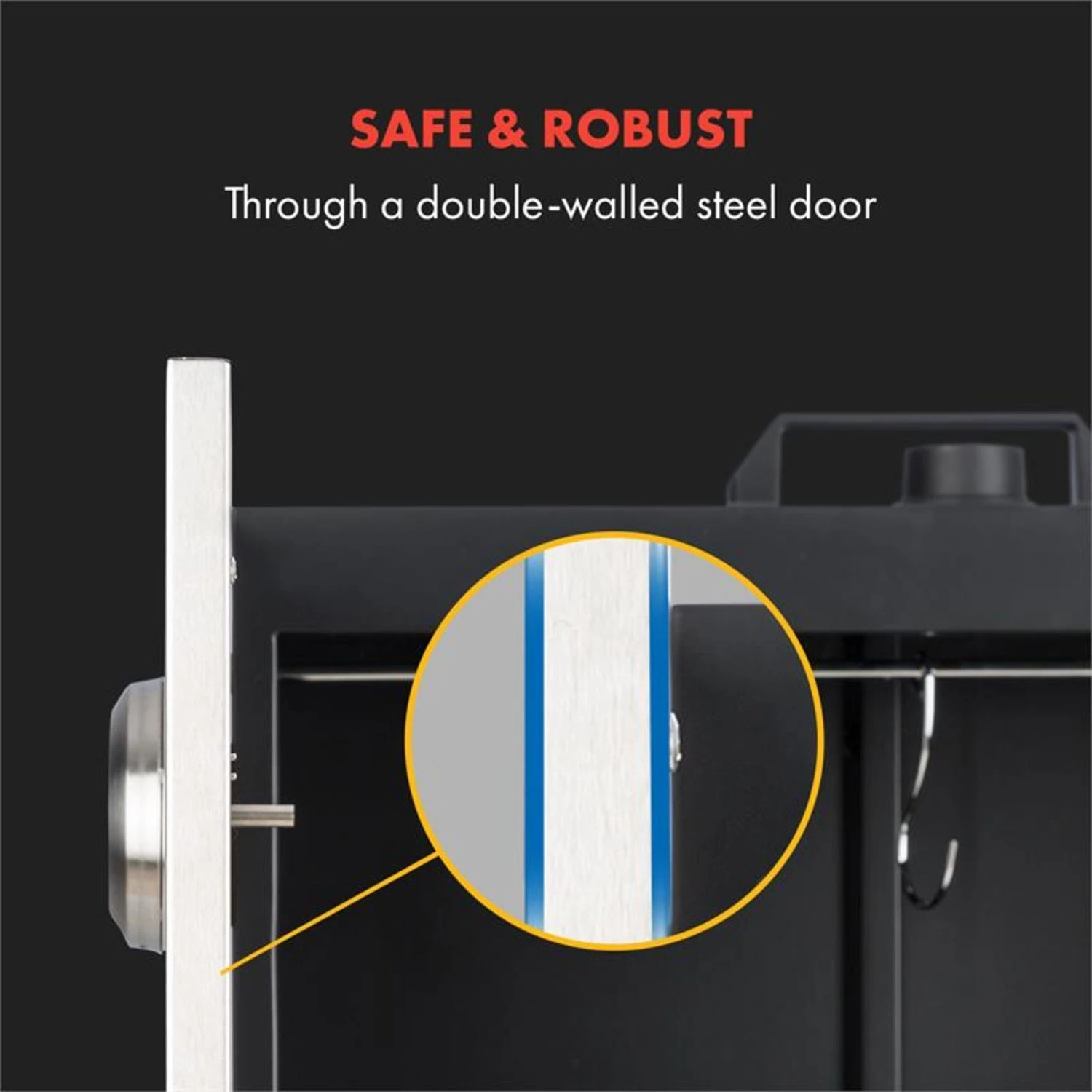 Entdecken Sie die traditionelle Kunst des Räucherns. Mit dem Klarstein Flintstone Steel Räucherofen verleihen Sie verschiedensten Speisen ganz nach eigenen Wünschen den richtigen Geschmack. Und nebenbei erhalten Fleisch, Fisch oder Wurstwaren eine deutlich längere Haltbarkeit! Mit einem 1600 Watt starken, elektrischen Heizelement sowie einem regelbaren Thermostat an der Oberseite des Gerätes bringt der Ofen die Aromaholzschnitzel ordentlich zum Rauchen und gart gleichzeitig die Räucherware ganz langsam zur Perfektion. Drei verchromte Räucherroste mit jeweils 40 x 25 cm Fläche bieten reichlich Platz für Speckseiten, Tofublöcke oder eigene Wurstkreationen, während drei Haken zusätzlichen Platz zum Aufhängen von Würsten oder Schinken bieten. Eine herausnehmbare Tropfschale fängt Kondenswasser und abtropfendes Fett und erleichtert die anschließende Reinigung. Die Dichte des Rauchs wird beim Klarstein Flintstone Steel Räucherofen ganz bequem über eine rückseitige Lüftungsklappe reguliert. Ein in die Tür integriertes Thermometer bis 300 °C macht die Überwachung der Räuchertemperatur ganz einfach. Räucherschnitzel und -aromen werden in der herausnehmbaren Edelstahlschüssel direkt über dem elektrischen Heizelement in leckeren Rauch verwandelt. Dank der Leichtbauweise und einem topseitigen Tragegriff lässt sich der Räucherofen mit wenig Aufwand versetzen.