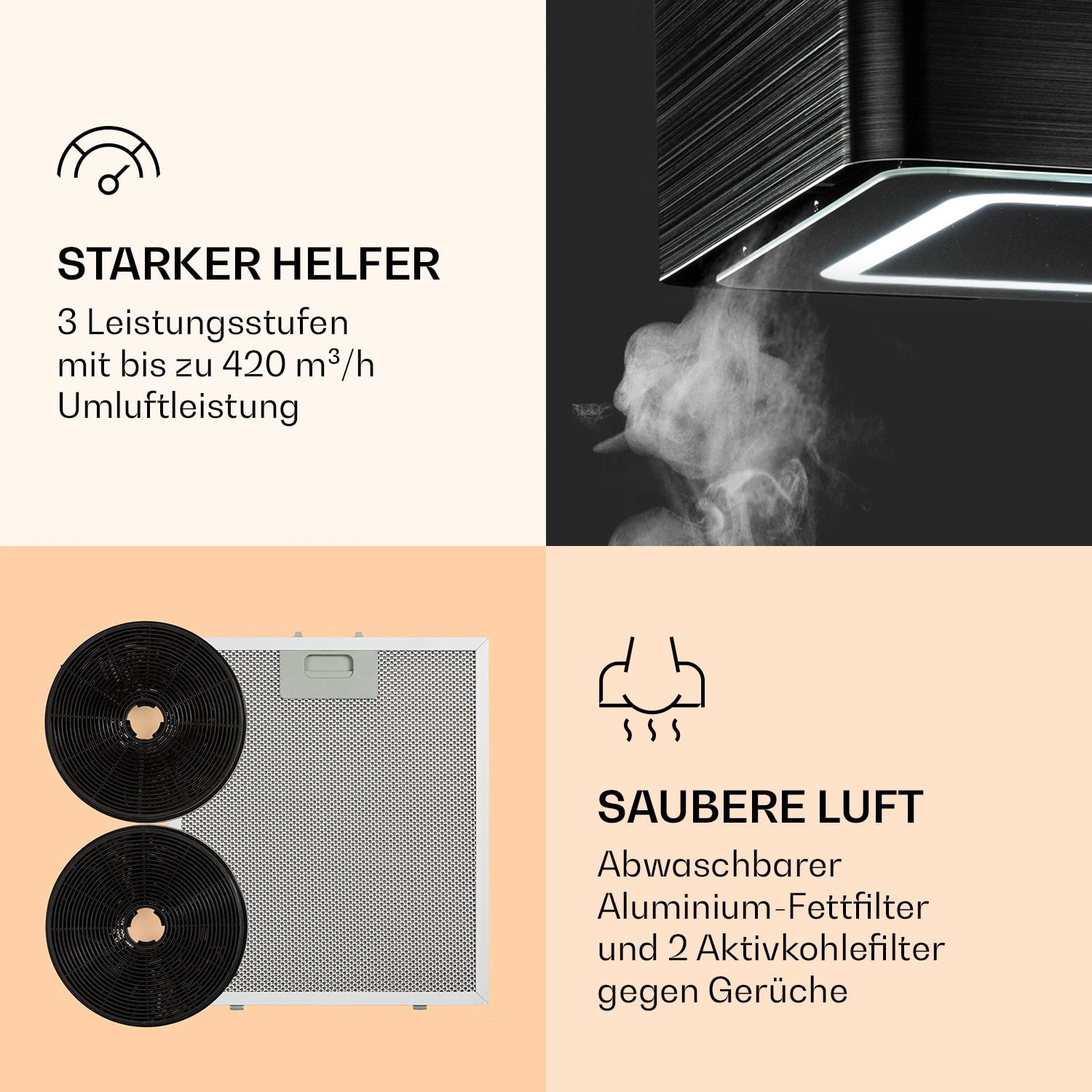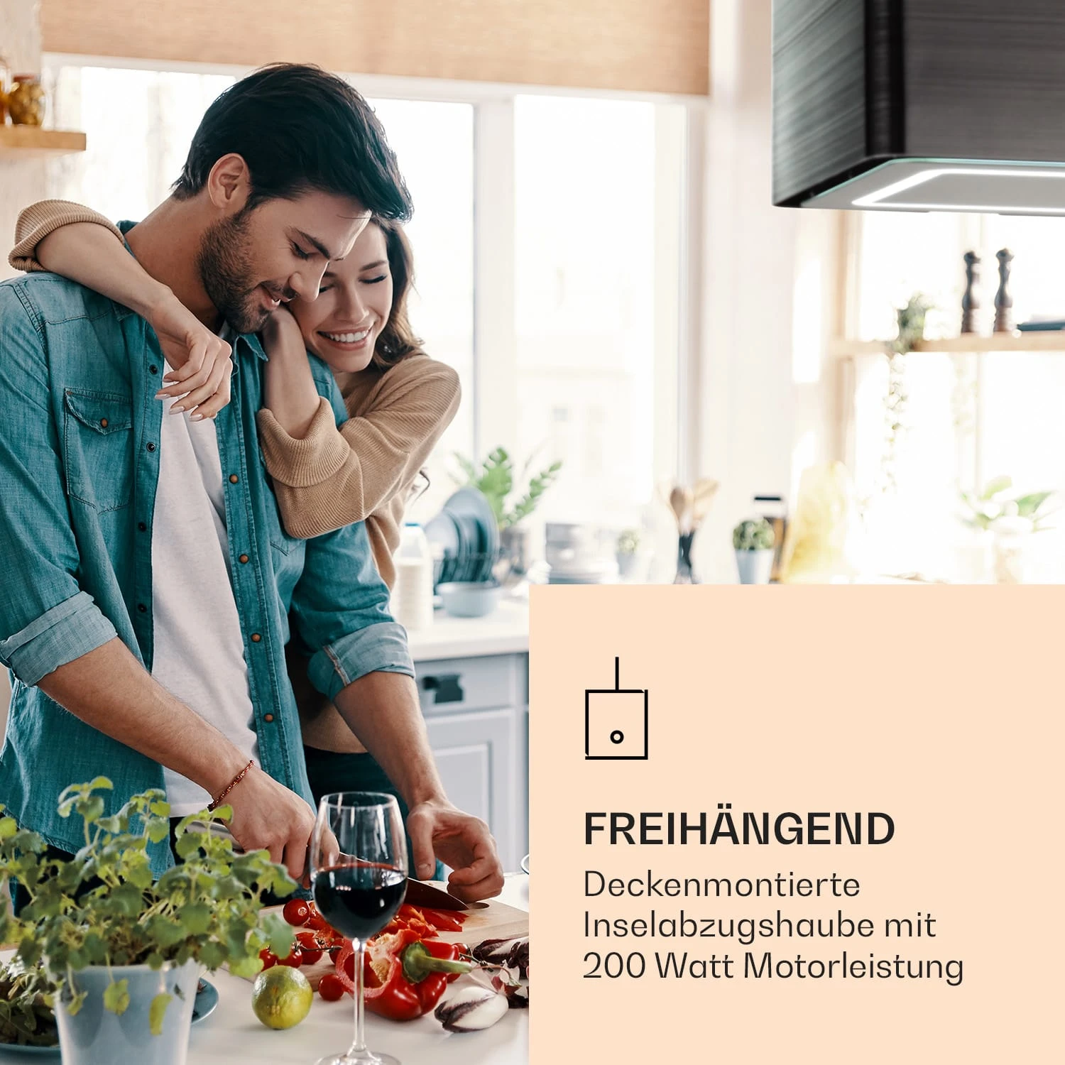 Zurück in die Zukunft: Die Klarstein Futurelight Smart Inselabzugshaube bringt eleganten Glanz in die Küche und befreit sie von Dampf und Gerüchen via App- oder Gestensteuerung. Ganz smart verrichtet die Dunstabzugshaube ihre Dienste per Steuerung mit der Klarstein-App. Egal wo du bist, mit deinem Smartphone oder Tablet kannst du die Haube ein- und ausschalten sowie eine ihrer drei Leistungsstufen wählen. Die beseitigen Dunst und Gerüche mit bis zu 420 m³/h Umluftleistung. Für perfekte Sicht auf die Töpfe und Pfannen sorgt das integrierte, weiße LED-Licht. Und solltest du gerade dein Handy nicht zur Hand haben, dann reicht auch ein einfacher Wink, um der Gestensteuerung deine Wünsche mitzuteilen. Smart, edel und saubere Luft: die Klarstein Futurelight Dunstabzugshaube ist die Zukunft in der Küche.