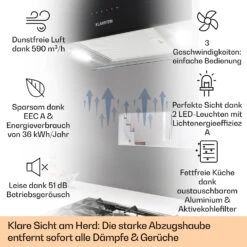 Edel im Pure Ambience Design ist auch das äußere Erscheinungsbild der Klarstein Kronleuchter XL Inselabzugshaube. Die Front- und Rückseite strahlen in luxuriösem, schwarzem Sicherheitsglas, während sich die Seiten mit gebürstetem Edelstahl präsentieren.