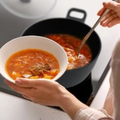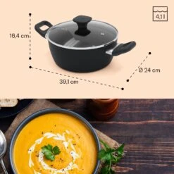 Für Abwechslung auf dem Herd – Design made in Berlin: Der Klarstein Noto Endurance Kochtopf ist dein neuer praktischer Helfer in der Küche, wenn es darum geht, Kaltes heiß zu machen. Der 24 cm durchmessende Kochtopf aus geschmiedetem Aluminium fasst bis zu 4,1 Liter und ist für alle Arten von Küchenherd von Gas bis Induktion geeignet. Bei den ergonomischen Cool-Touch-Griffen haben unsere Berliner Designer besonders auf einfaches und unkompliziertes Handling geachtet. Der passende Glasdeckel hält die Hitze im Inneren und spart so nicht nur Energie, sondern lässt Speisen auch schneller kochen. Die Anti-Haft-Beschichtung mit Keramik ist PFAS-frei und ausgesprochen langlebig. Und natürlich ist der Klarstein Noto Endurance Kochtopf komplett spülmaschinenfest. So macht Kochen Spaß!
