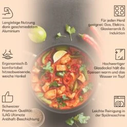Für Abwechslung auf dem Herd – Design made in Berlin: Der Klarstein Noto Endurance Kochtopf ist dein neuer praktischer Helfer in der Küche, wenn es darum geht, Kaltes heiß zu machen. Der 28 cm durchmessende Kochtopf aus geschmiedetem Aluminium fasst bis zu 6,1 Liter und ist für alle Arten von Küchenherd von Gas bis Induktion geeignet. Bei den ergonomischen Cool-Touch-Griffen haben unsere Berliner Designer besonders auf einfaches und unkompliziertes Handling geachtet. Der passende Glasdeckel hält die Hitze im Inneren und spart so nicht nur Energie, sondern lässt Speisen auch schneller kochen. Die PTFE-Anti-Haft-Beschichtung aus Keramik ist PFAS-frei und ausgesprochen langlebig. Und natürlich ist der Klarstein Noto Endurance Kochtopf komplett Spülmaschinenfest. So macht Kochen Spaß!