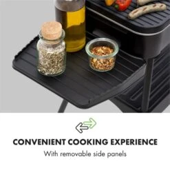 Am Standfuß des Porterhouse Elektrogrills befestigt ist eine praktische Ablage für Grillgut, Zangen oder andere nützliche Helfer. Zusätzliche Ablagemöglichkeiten ergeben sich aus den abnehmbaren Seitenteilen, die sich beispielsweise hervorragend für Gewürze oder Soßen eignen.