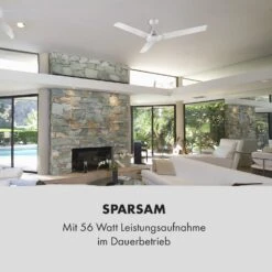 Mit seinem Rotordurchmesser von 122 cm und drei Geschwindigkeiten bewegt Klarsteins Spin Doctor Deckenventilator bis zu 9963 m³ an Luft in der Stunde. Das sorgt für konstante, erfrischende Luftbewegung im ganzen Raum und hilft der körpereigenen Temperaturregulierung. Dabei glänzt er mit seinem angenehm niedrigen Verbrauch von nur 56 Watt auch im Dauerbetrieb.