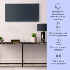 Die Klarstein Taal Smart Infrarotheizung revolutioniert die Beheizung mit moderner Technik. Superflach kann das 105 x 56 cm große Heizpanel platzsparend aufgestellt werden. Es verfügt über robuste Füße und einen Kippschutz: Sollte deine neue Standheizung unerwartet fallen, schaltet sie sich auotmatisch ab. Mit 750 Watt Leistung verbreitet sie zu 70 % für die menschliche Haut sehr angenehme Infrarotwärme. Durch die innovative IR ComfortHeat-Technologie wird die Wärme dabei gezielt an Personen abgegeben und nicht an die Luft der Umgebung. Die weiteren 30 % der Leistung liefert das hybride Heizsystem durch Konvektoren, welche die Raumluft erwärmen.