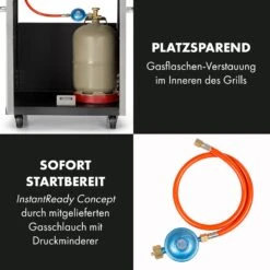 - Möglichkeit zur Installation eines Drehspießes zur Zubereitung von Grillhühnchen oder Haxenbraten