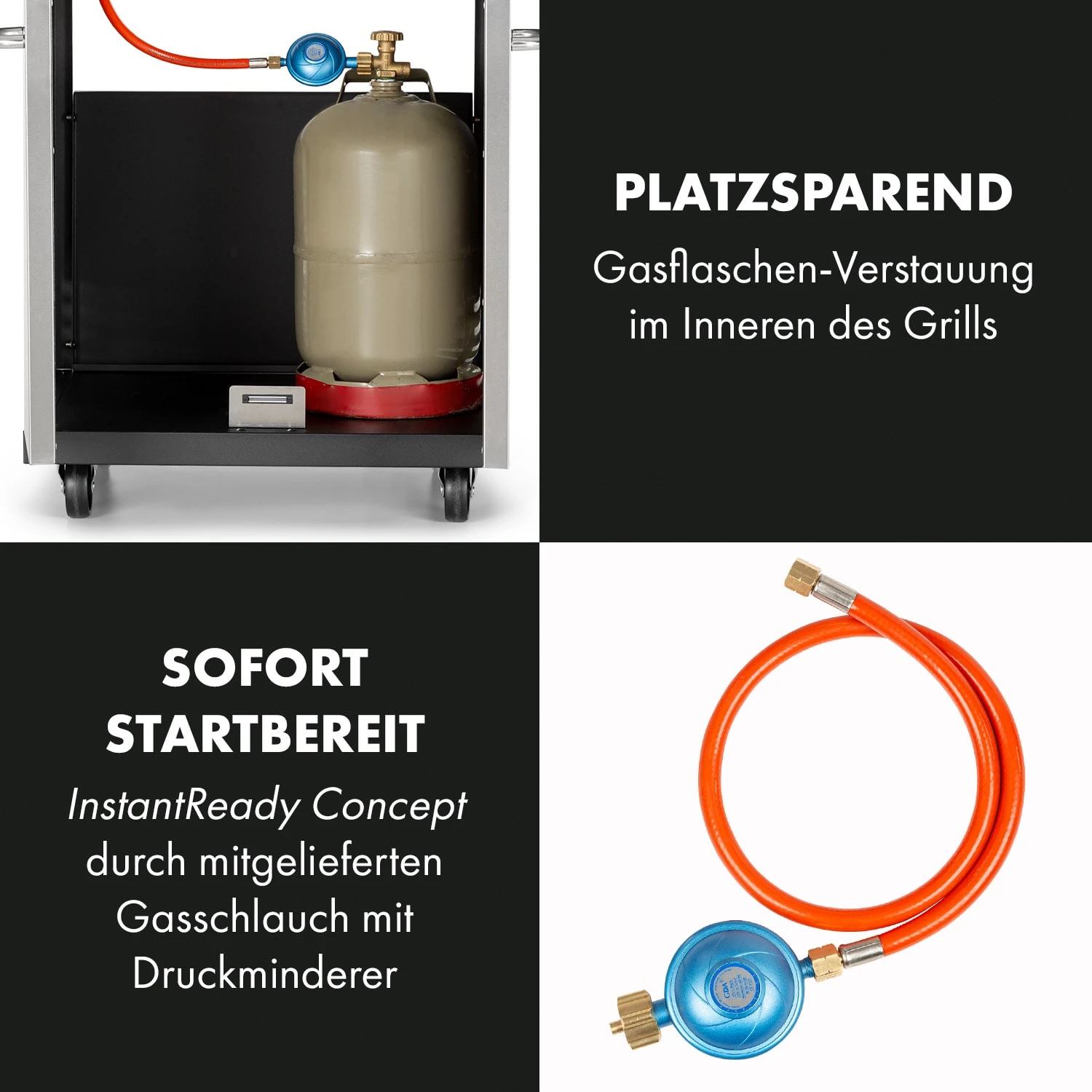 Starke Hitze ohne Rauch, mit dem Klarstein Valkyrie Gasgrill kein Problem. Drei Brenner mit je 3,2 kW Leistung sowie ein zusätzlicher Seiten-Brenner mit 2,9 kW Leistung sorgen für anständig Hitze unter dem Grill. Dank SnapJetIgnition System mit batterieloser Piezozündung werden sämtliche Brenner bequem und augenblicklich per Knopfdruck gestartet. Im Sinne unseres InstantReady Concepts sind Druckminderer und Gasschlauch direkt dabei und sorgen für sofortige Einsatzbereitschaft des Gasgrills. Der bietet sich mit seinem emaillierten Gusseisengrillrost von 54 x 42 cm für verschiedenstes Grillgut an: herzhafte Steaks, knackige Würste, leckeres Grillgemüse oder saftiger Fisch. Damit ist es ein Leichtes, die ganze Familie und Freunde mit leckerem Grillgut zu versorgen. Die können direkt große Augen machen, denn die Edelstahl-Haube bietet mit ihrem großen Sichtfenster leckere Einblicke, wenn Spezialitäten des passiven Grillens wie Pulled Pork oder Spare Ribs zur Perfektion garen.
