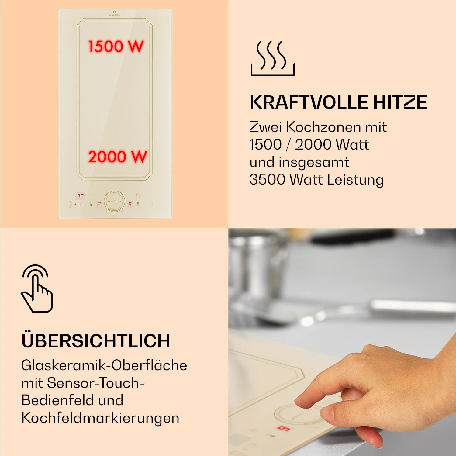 Einfach flexibler Kochen: Das Klarstein Victoria Induktionskochfeld erlaubt die optimale Platznutzung mit minimalem Energieverbrauch beim Kochen. Zwei Kochflächen bringen mit insgesamt 3500 Watt die Inhalte deiner Töpfen und Pfannen in Spitzenzeiten zum Kochen und können per VarioHeating zu einer Flexzone vereint werden. Beide Einzelfelder lassen sich separat in ihrer Leistung regeln und verfügen über eine ThermoBoost-Funktion, die mit erhöhter Leistung zum schnellen Erhitzen überzeugt. Bedient wird das Victoria Glaskeramik-Kochfeld unkompliziert mit einem integrierten Sensor-Touch-Bedienfeld und Digitaldisplay. So durchbrechen weder Knöpfe noch Regler die Oberfläche der Küchenzeile. Optisch überzeugt das Victoria Induktionskochfeld von Klarstein mit seiner pflegeleichten und edlen Oberfläche aus Glaskeramik: So fügt sich das Kochfeld spielend in jede Küchenzeile ein – egal ob klassisch oder modern.